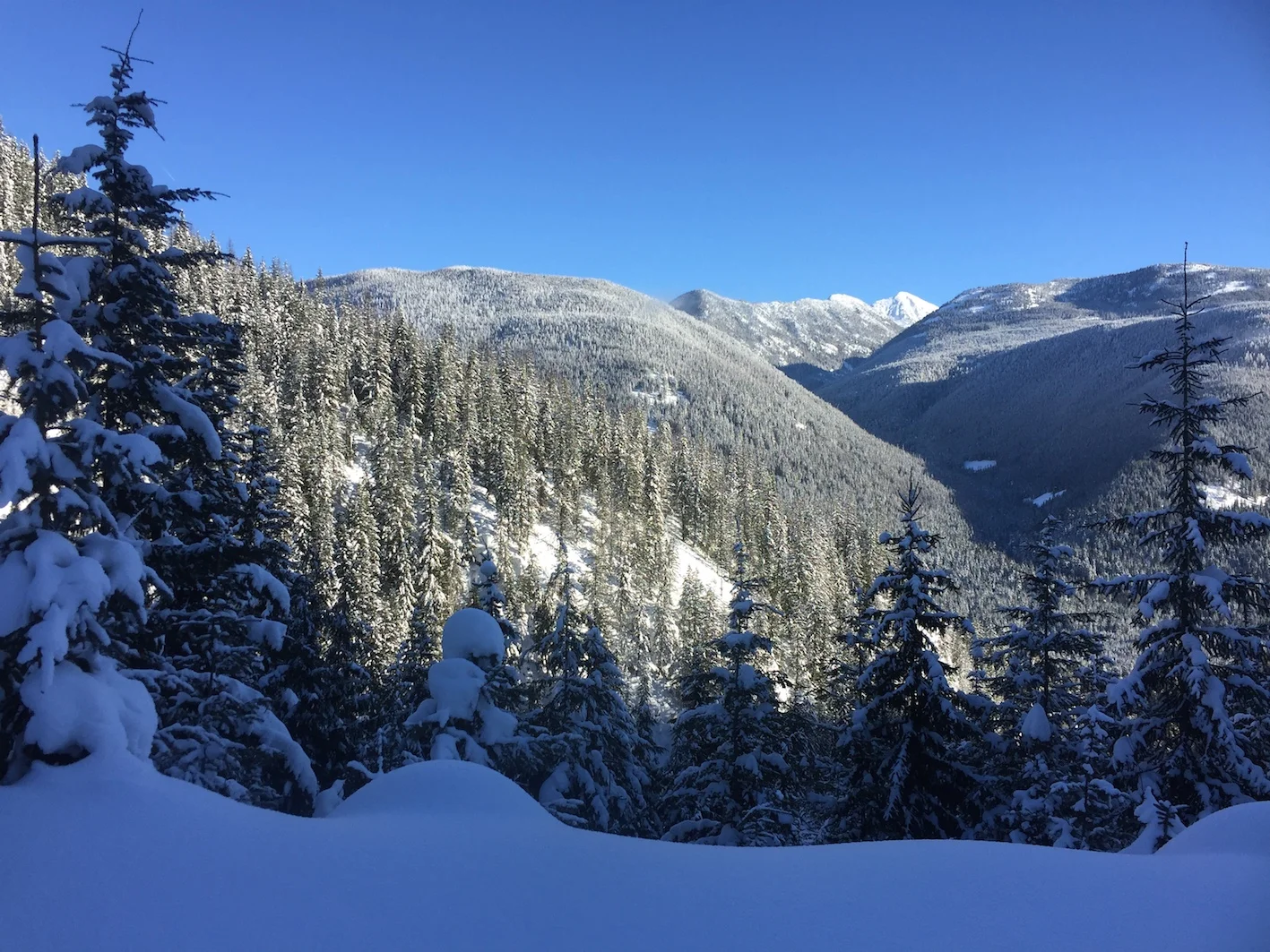 It was not long before I was searching once again for the trail. It took too much energy and time to not be directing my energy in exactly the place I wanted to be heading. I decided to rely on the compass in my head and used the terrain as a map to guide me up over the pass and down into the steep valley on the other side. I was slightly nervous and excited for my first real downhill of the journey. Cautious not to gain too much speed I started down in fresh powder. Unfortunately the open terrain quickly closed up and I found myself on a narrow trail running along side a steep gully. Having never telemark skied before I found it tricky to turn and slow down on the open slopes, now I would have to figure out how to slow down on a two foot wide path. I realized the best approach was to put the skins back on my skis in order to slow my downhill progress.